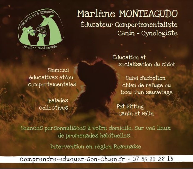 Avec votre éducateur et comportementaliste canin Marlène Monteagudo localisé à Roanne, spécialiste en psychologie canine et relation Chien/Humain.